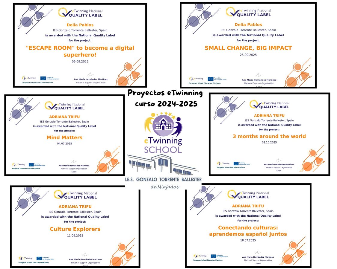 A lo largo del curso anterior, nuestro centro ha obtenido seis sellos de calidad nacional eTwinning, un reconocimiento otorgado por el Servicio Nacional de Apoyo eTwinning que valora la calidad, la innovación y la colaboración en proyectos europeos desarrollados junto a otros centros educativos.